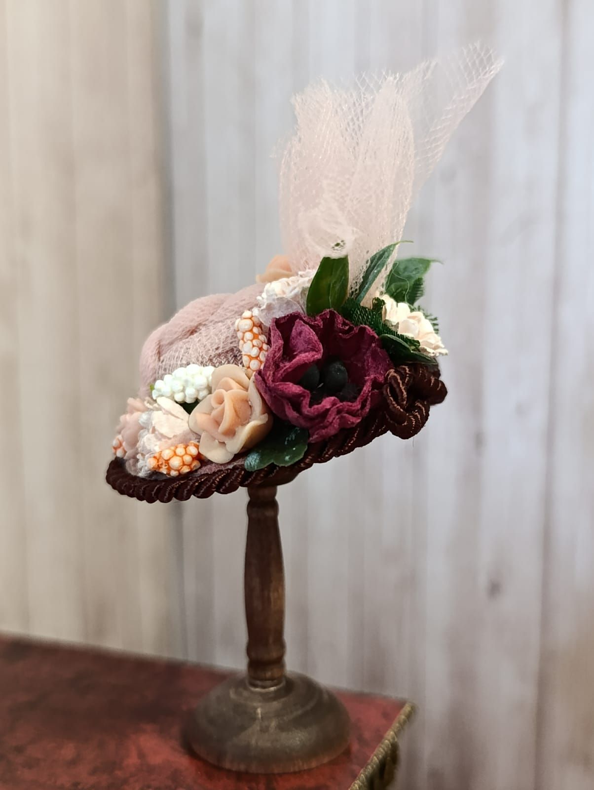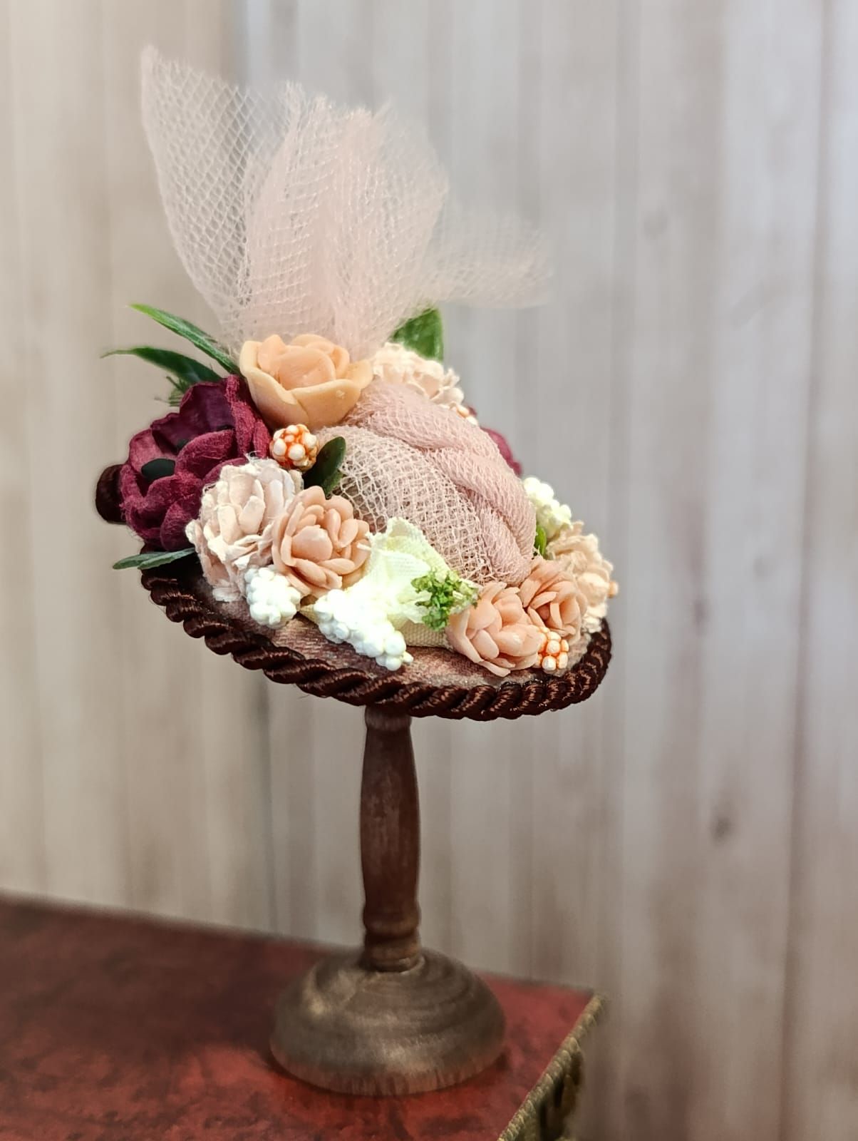 Deze elegante Bordeaux rode hoed, voorzien van stijlvolle oud roze accenten, is perfect voor jouw 1:12 schaal model. De bovenkant van de hoed is prachtig gedetailleerd met een verfijnde vlecht, wat extra charme en karakter toevoegt. De rand van de hoed is mooi afgewerkt met een luxueus zijdekoord, dat een vleugje verfijning biedt. Let op, deze hoed wordt geleverd zonder hoedenstandaard, waardoor je de vrijheid hebt om hem op jouw eigen manier te presenteren. Deze hoed is een uitstekende aanvulling voor elke collectie en zal zeker de aandacht trekken!