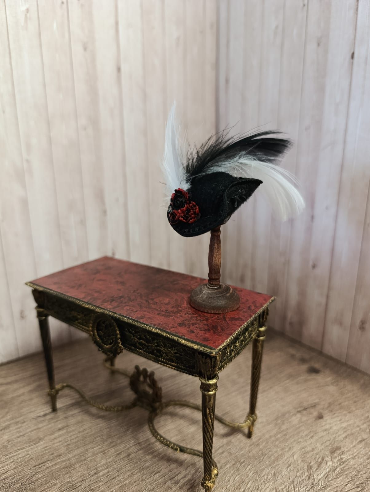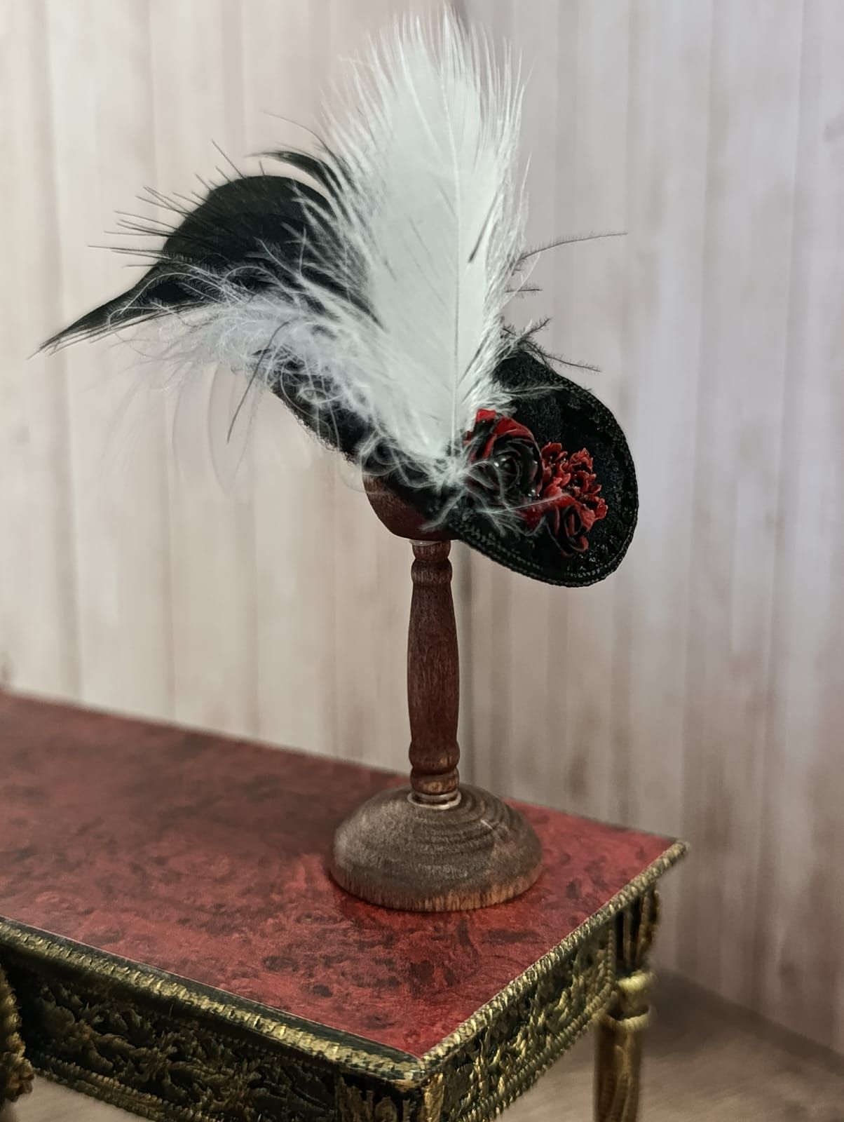 Ontdek dit prachtige zwarte miniatuurhoedje, perfect voor elke verzameling of als decoratief accent! Dit hoedje, in de schaal 1:12, is subtiel versierd met opvallende rode en witte details die het ontwerp een unieke flair geven. Het is een ideaal accessoire voor poppenhuizen of als onderdeel van een artistieke display. Let op: de hoed wordt geleverd zonder hoedenstandaard, waardoor je de vrijheid hebt om het hoedje op verschillende manieren te presenteren. Voeg dit charmante item toe aan je collectie en geef je decoratie een speelse touch!