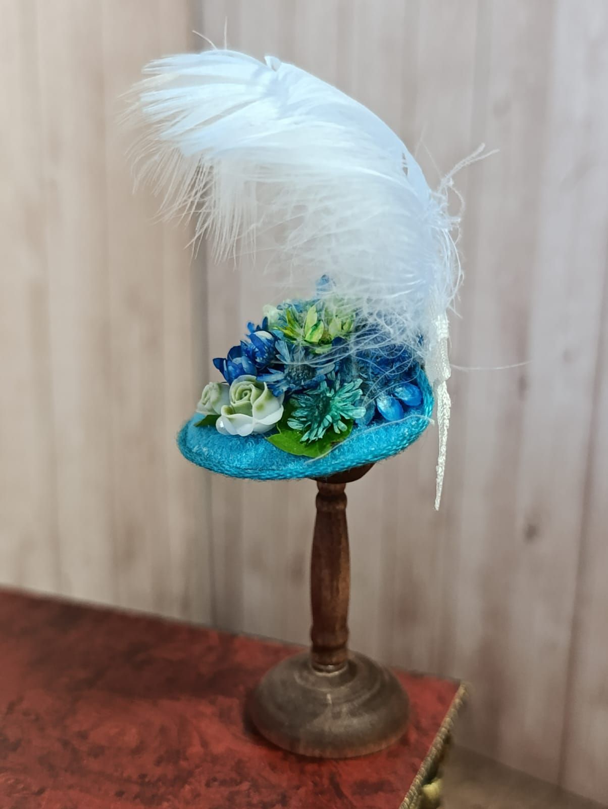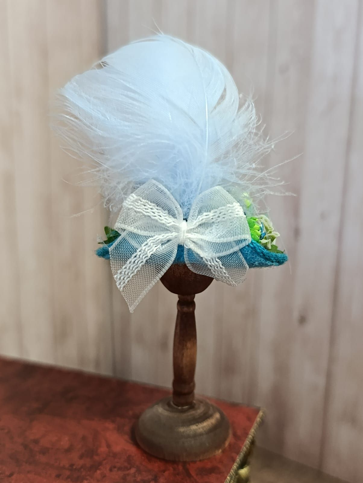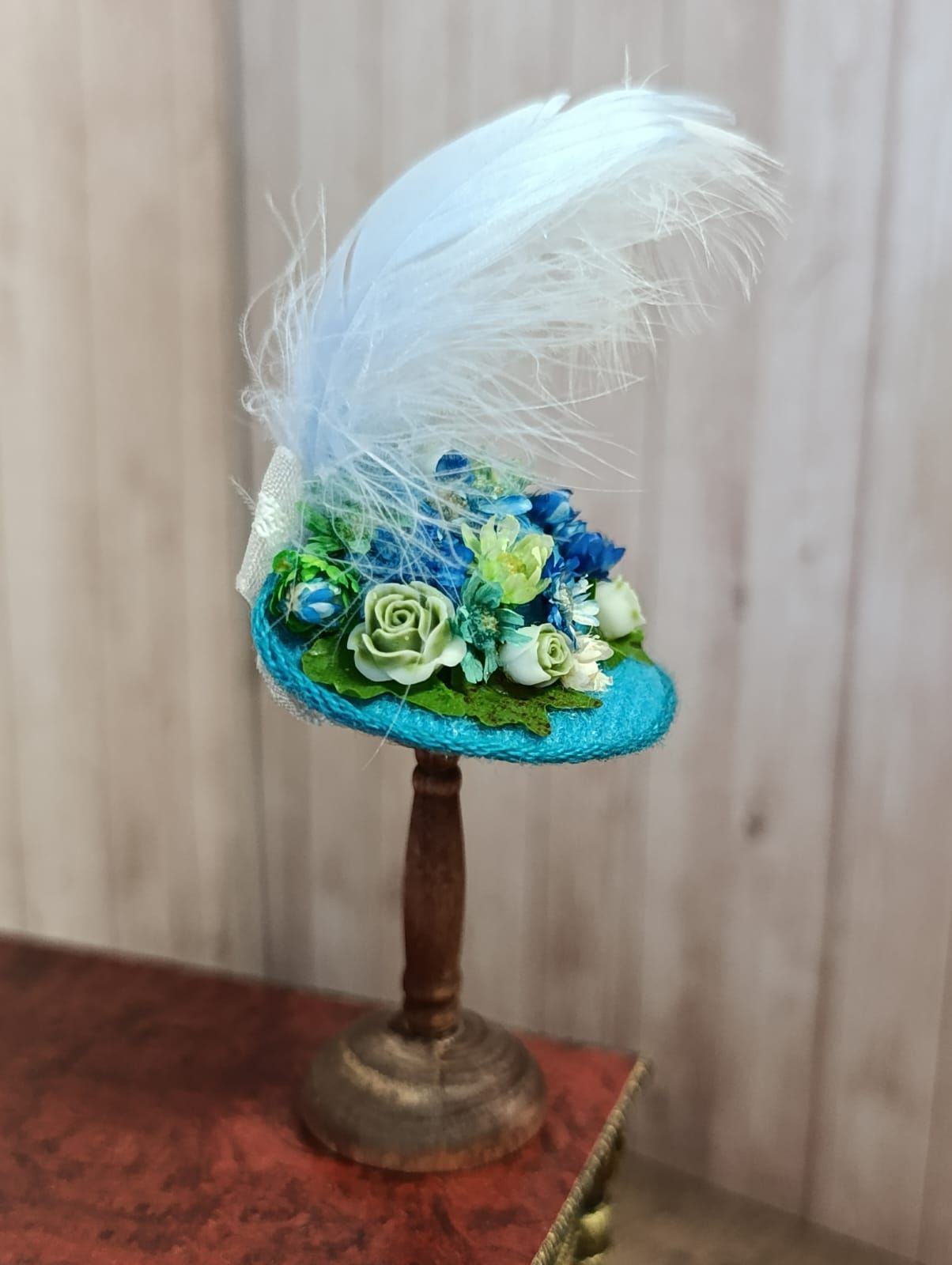 Deze prachtige turquoise hoed is ontworpen met oog voor detail en heeft opvallende blauwe en groene accenten, perfect voor miniatuurliefhebbers of als decoratieve aanvulling op je collectie in schaal 1:12. De hoed is voorzien van een grote strik aan de achterkant, verfraaid met elegantere veren die een vleugje flair toevoegen. Dit unieke stuk wordt geleverd zonder een hoedenstandaard, waardoor je zelf de perfecte plek kunt kiezen om deze stijlvolle hoed te presenteren. Voeg een sprankje kleur en creativiteit toe aan je miniatuurwereld met deze betoverende accessoire!